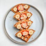RD$ 495.00 Waffles a base de harina gluten free, avena, leche de almendras, canela y maple syrup, con toppings de guineo, fresas y coconut flakes.