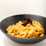 RD$ 525.00 Pasta a base de arroz cubierta en salsa de “queso” a base de semillas de cajuil, batata americana, zanahoria y pimientos con un topping de “bacon” a base de hongos ahumados.
