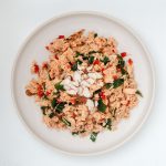 RD$ 665.00 Filete de salmón, ají morrón, almendras fileteadas, espinaca, albahaca, tamari, aceite de oliva extra virgen, vinagre de manzana y de arroz. --------------------- | |