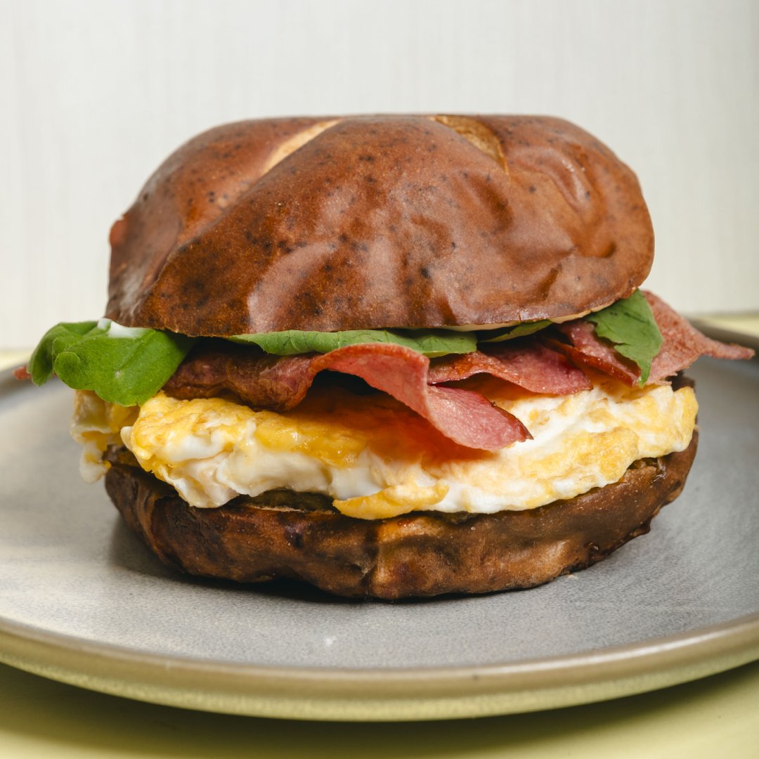 Pan pretzel masa madre relleno de huevos, tocineta de pavo, rúcula, VITA pesto de tomates secos y toque de aioli.